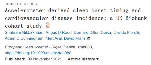 [1]Shahram Nikbakhtian, Angus B Reed, et al. Accelerometer-derive sleep onset timing and cardiovascular disease incidence: a UK Biobank cohort study[J].European Heart Journal - Digital Health, 2021.