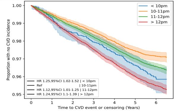 经过平均5.7年的随访,研究人员发现3172名(3.58%)参与者患上了心血管疾病(包括心力衰竭、心肌梗塞、慢性缺血性心脏病、中风、短暂性脑缺血发作等),对这些心血管疾病患者进行入睡时间关联研究后发现:以晚10-11点睡觉为基线,10点前睡觉的人,心血管疾病风险增加24%!