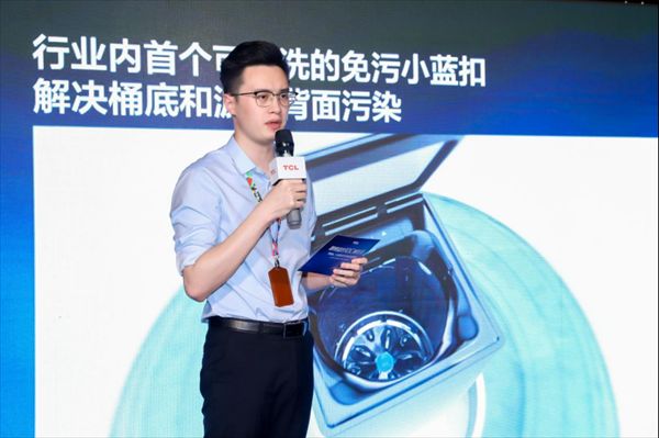 针对洗衣二次污染,TCL提出了解决方案,TCL产品经理龙文韬对此进行了分享。作为行业首个可拆洗技术,TCL独家专利“免污小蓝扣”用三步解决了困扰行业已久的难题,便捷可拆卸的小蓝扣实现了对洗衣机波轮盘与桶底的快速、高效清洗。面对市场上大部分洗衣机产品仅解决了三分之一洗衣污染的现状,TCL聚力突破,通过免污小蓝扣搭配桶自洁程序和纳米银离子除菌技术,让污垢、细菌无处躲藏,使洗衣二次污染问题得到全面解决。TCL小蛮腰系列免污洗衣机带来了更高效、便捷的健康洗衣体验,为未来生活解锁了新的方向与可能性。
