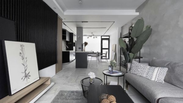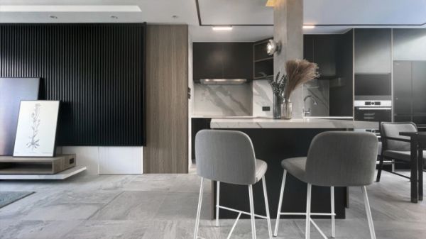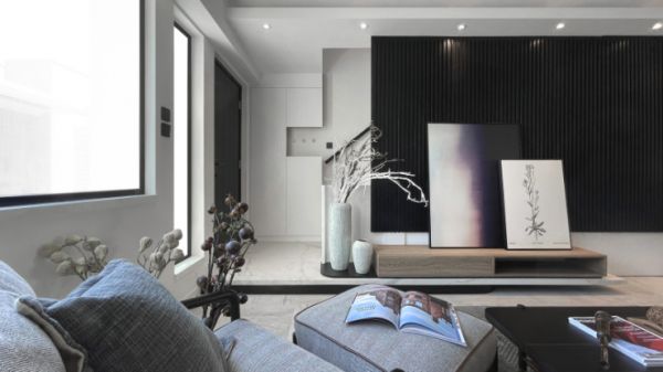 是次别墅的客厅用了黑、白、木为主调,全屋焦点是客厅电视特色墙,由黑色木条子在上方,比例占大部份,下方由白色衬托,营造凌空感觉,而且它不止是一幅特色墙,还融合了一度条子趟门,完美隐藏了楼梯底下的客厕,不失美观之余及有助扩大特色墙视觉上的效果,此趟门还有一亮点,就是把手位置是用同一物料作弧形制作,寓意凡是不要只看表面,稍微揭开面纱,往往内有乾坤,这弧形把手和特色墙白色弧形部份也有所呼应, 仿似"太极"图案,互相紧扣,"由内及外"、"内外合一。"