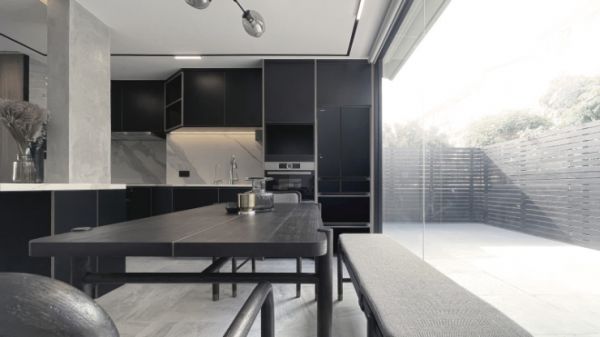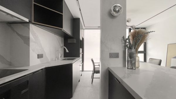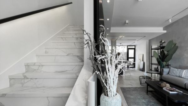 开放式厨房,故意保留柱及横梁位配以中岛设计, 进一步带出空间与结构之关结, 大花白岩板作楼梯面料, 贯通别墅的每一层