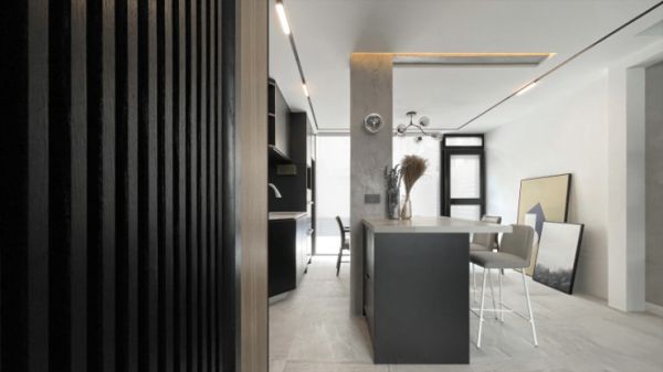 一甫进屋,由大花白岩板铺设的楼梯及伸延至特色墙下方之基座,作为欢迎客人的一个引子, 配合特色墙黑木条子饰面,给人一份宁静、清幽的禅意。
