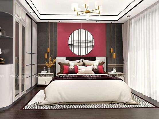 对于卧室背景墙的选择,特地精心挑选了石榴红,搭配中式装饰画框,精美的纹理更带来流动之美卧室色感,和谐处于当中点缀气质,体现出主卧日常的温馨与幸福,打造一种更舒适的氛围。