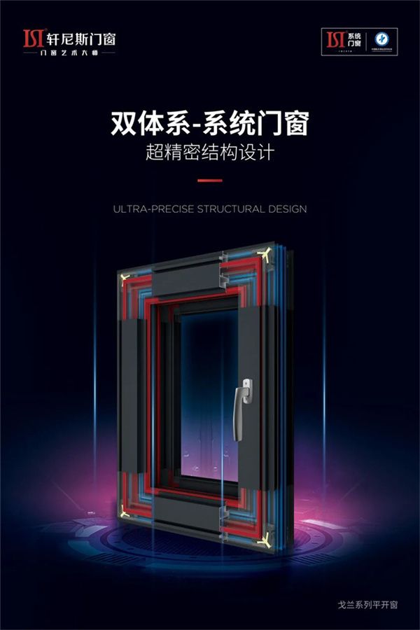 “双体系”系统门窗,是轩尼斯门窗追求完 美门窗解决方案的创新力作,极具前瞻性与开创性的研发理念与设计制造工艺。作为轩尼斯门窗双体系-系统门窗的第 一款产品——戈兰系列平开窗,对轩尼斯门窗品牌以及系统门窗行业具有创新性的标 杆意义。