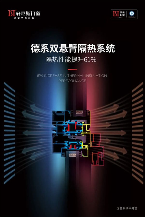 戈兰系列平开窗采用德系双悬臂隔热设计,40毫米的桥式隔热框架、7腔体致密平衡结构,能有效减少腔体空气的对流,突 破性地将门窗隔热性能提升61%,极 大提高门窗的环保、节能效果,同时也为高寒区域的消费者提供了更好的选择!