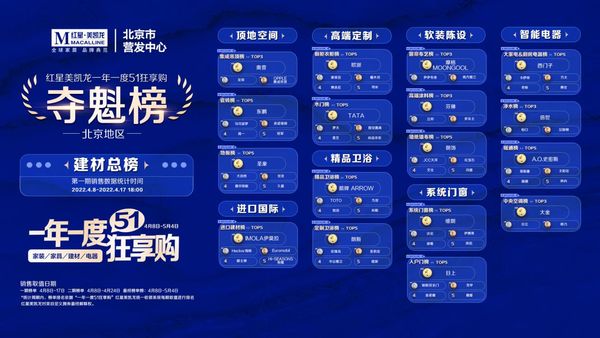 这张“夺魁榜”是红星美凯龙北京市营发中心基于五一活动的第一期,以统一收银为依据,总结2022年4月8日-4月17日的销售数据得来,主要锁定家具、建材两大品类,家具榜主要设立睡眠生活榜、设计客厅榜、潮流家具榜、进口国际榜,建材榜主要设立高端定制榜、精品卫浴榜、系统门窗榜、顶地空间榜、软装陈设榜、智能电器榜,全面覆盖北京五大商场的120个家具、建材品牌,在4月8日-4月17日期间,掀起了火热的夺冠排位赛。
