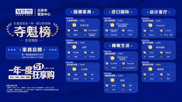 这张“夺魁榜”是红星美凯龙北京市营发中心基于五一活动的第一期,以统一收银为依据,总结2022年4月8日-4月17日的销售数据得来,主要锁定家具、建材两大品类,家具榜主要设立睡眠生活榜、设计客厅榜、潮流家具榜、进口国际榜,建材榜主要设立高端定制榜、精品卫浴榜、系统门窗榜、顶地空间榜、软装陈设榜、智能电器榜,全面覆盖北京五大商场的120个家具、建材品牌,在4月8日-4月17日期间,掀起了火热的夺冠排位赛。
