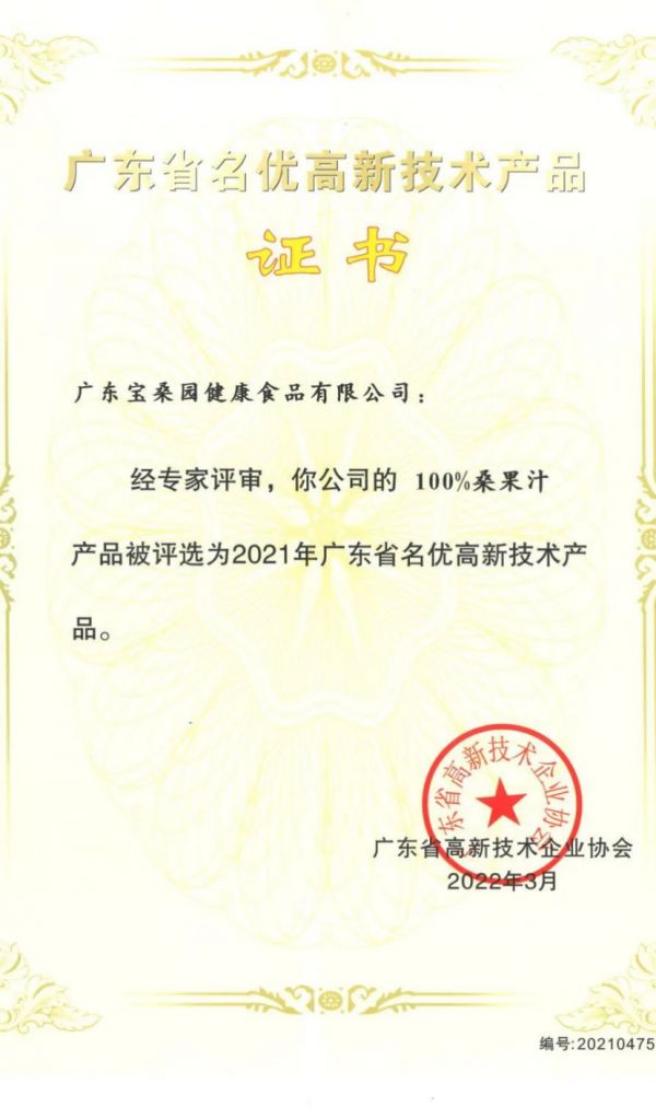 据悉,宝桑园NFC100%桑果汁不仅获得了“中国绿色食品”认证标志,更被评选为“2021年广东省名优高新技术产品”,品质经得起考验。