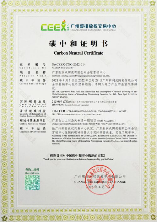 近日,经广州碳排放权交易中心认定,广东新润成陶瓷有限公司全球营销中心注销的碳减排量大于实际碳排放量,实现了碳中和。据悉,广东新润成陶瓷有限公司全球营销中心完成2021年4月1日至2022年2月28日碳排放盘查,碳排放量为215.069吨CO2e,完成注销碳减排量216吨CER。