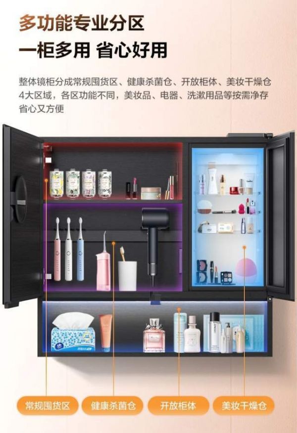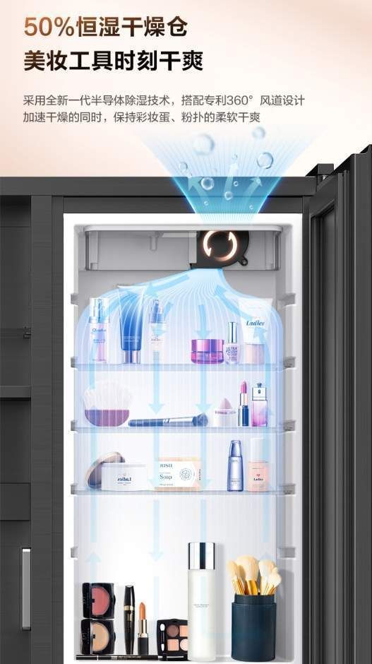美的小仙境智能浴室镜柜犹如护肤用品“小管家”,其50%恒湿干燥仓能专业呵护每一瓶化妆品、护肤品,全新一代半导体除湿技术加持专利360°风道设计,让内部空气保持干净清爽的状态,营造适合护肤品存放的湿度环境。平时护肤将精华和安瓶放在这里,再也不担心会氧化变质的问题,粉扑也都是柔软干爽的质感。用专业恒湿干燥仓换取更自在的生活方式,悦享每日护肤时刻带来的魅力与快乐。