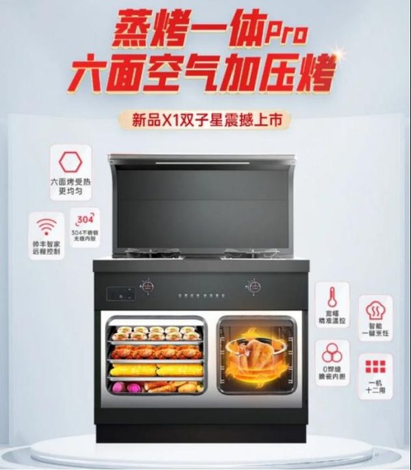 2021上半年,帅丰推出了X1双子星蒸烤集成灶,搭载了“六面空气加压烤”的技术,利用“空气”介质对食物进行烹饪,和空气炸锅的运行原理基本一致。