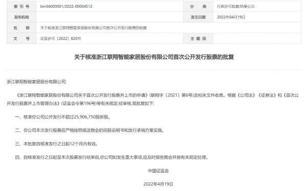 浙江联翔智能家居股份有限公司IPO获批文 即将登陆上交所主板