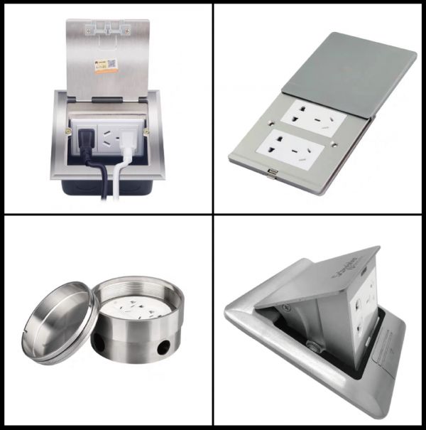 地插面板的主要材质有铜合金、锌合金、不锈钢和纯黄铜,根据大小不同分为单联和双联,有弹起式、开启式、螺旋式和平推式四种开合方式。