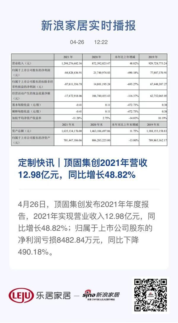 新浪定制频道讯 4月26日,顶固集创发布2021年年度报告,2021年实现营业收入12.98亿元,同比增长48.82%;归属于上市公司股东的净利润亏损8482.84万元,同比下降490.18%。