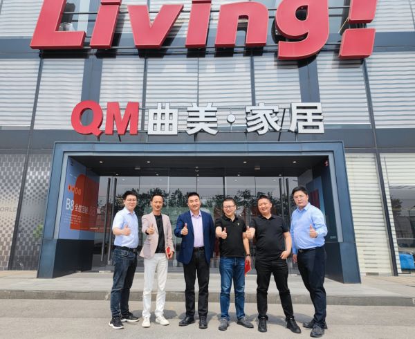 图:曲美集团耀星家领导和广东华宁装饰集团一行在曲美家居北京五环店前留影