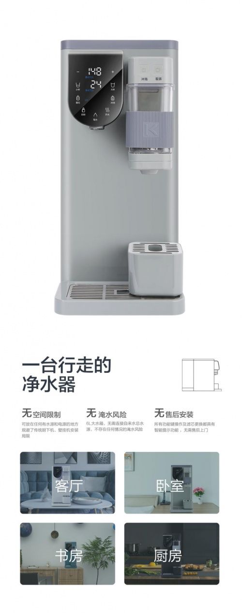 科恩多功能移动式净水器R6068,无空间限制,可放在任何水源和电源的地方,规避了传统厨下机、壁挂机安装局限;无淹水风险,6+1.8L大容量水箱,无需连接自来水总水源,不存在任何情况的淹水风险;无售后安装,所有功能键操作及滤芯更换都具有智能提示功能,无需售后上门安装。
