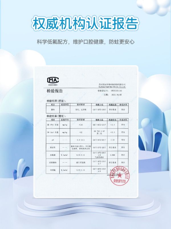 根据牙膏国家标准GB/T8372-2017,儿童牙膏氟含量应在500ppm-1100ppm之间。纳美宝贝儿童牙膏严格参照国家标准,采用科学的低氟配方,帮助宝贝减少蛀牙风险,让宝贝的口腔更健康。