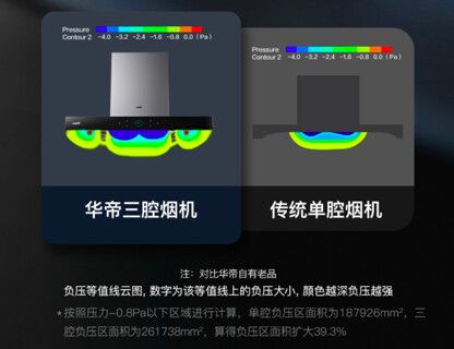 华帝三腔油烟机的腔体中间,作为高负压区主烟腔进行有效的拢烟,两侧作为低负压区辅助腔体防止油烟两侧逃逸。相比于传统的单腔、双腔布局,三腔可以大大增加进风口负压区域面积,提高油烟机的吸力,增大风量。