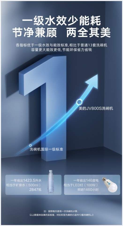 一直以来,洗碗机行业都缺乏清晰、统一的评价标准,如今,由国家市场监督管理总局和国家标准化管理委员会发布的《洗碗机国家能效标准》近期正式执行,为消费者合理选择提供了标准。水效指数、能效指数、干燥指数和清洁指数都达到了一级标准可被评为一级水效,美的极光洗碗机JV800S就是符合一级水效的代表性产品。