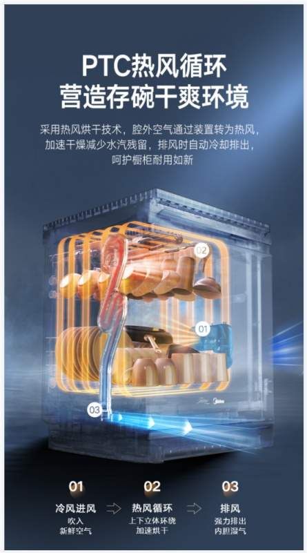 美的极光洗碗机JV800S特别搭载PTC循环热风烘干技术,能够快速带走水汽,让餐具高效干燥。其工作原理为腔外空气通过装置转为热风,加速干燥减少水汽残留,排风时自动冷却排出,营造干爽的内腔环境,从而有效抑制霉菌生长,每次使用餐具都安心。