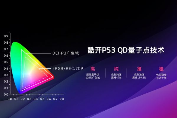 作为一款超画质量子点电视,酷开P53系列“青出于蓝而胜于蓝”,在量子点技术的加持上实现了画质上的突破。它搭载天生好色彩的QLED量子点显示技术,采用无机纳米晶体量子点显示材料应用到显示模组,能显示更大的色彩广度,能更好的提高色域、提纯色彩、增强色准度。同时,搭配了COO-VISION X量子画质引擎大幅提升每一帧画面的显示效果,10.7亿级色彩更惊艳,实现了美国电影行业显示标准DCI-P3广色域100%的突破,还拥有102% DCI-P3超高量子点广色域,色彩纯度提升47%,色彩更纯净,色彩准度提升154.9%,色彩更加真实。