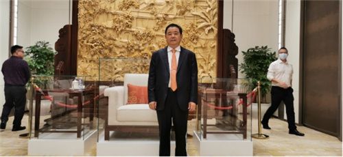 ▲ 仁豪家居董事长尤国忠先生与仁豪打造的“彩云追月”主题主席国椅