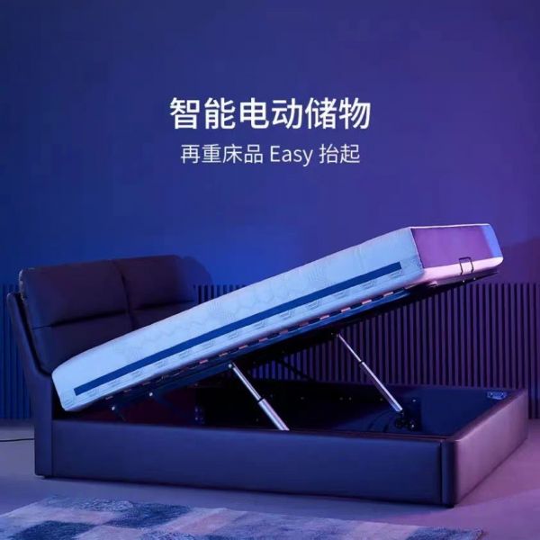普通储物床,通过人力抬起不仅费力而且一不小心容易砸伤手。小程序操控电动起落架,FCC高效电机,推力强劲,即停即止,不怕卡物。720L空间 ,大容量储物。