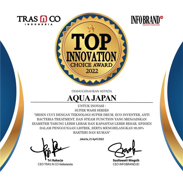 “最佳创新选择奖”由TRASN CO Indonesia和INFOBRAND.ID联合举办,旨在表彰创新产品和服务的品牌,在印尼创新领域享有盛誉。此次评选,TRASN CO Indonesia和INFOBRAND.ID对在印尼的数百家公司和品牌,从创新理念、创新优势、创新差异化三个方面进行评估考核。最终,AQUA洗衣机 Super wash系列从众多品牌中脱颖而出。