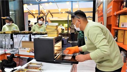 和一般餐饮店不同,店内没有做饭时的烟雾缭绕,却能闻到一阵阵的美食香味儿。一位年轻女孩下单了一份榴莲披萨,只见她先把披萨冷胚放进智慧烤箱,然后扫描包装盒上的二维码“叮一下”,烤箱就自动开启了烹饪,8分钟后就可以享用了。闲聊间她说到,以前做披萨不仅要和面制胚,费时费力还可能会烤糊。现在,简单3步就能烤好美味可口的披萨,这让她十分惊喜。