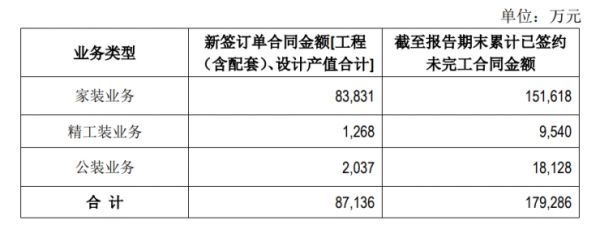 4月26日,东易日盛(002713.SZ)发布2022年第一季度装修装饰业务主要经营情况简报,一季度,公司新签订单合同金额约8.71亿元,其中,家装业务8.38亿元,精工装业务1268万元,公装业务2037万元。截至2022年3月31日,装修装饰业务累计已签约未完工合同金额17.93亿元。