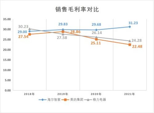 2018年至2021年,美的销售毛利率从27.54%下降至22.48%,格力销售毛利率从30.23%下降至24.28%。