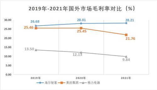 财报数据显示,海尔智家海外毛利率持续上涨,从2019年的26.68%提升至2021年的28.21%。同期来看,美的、格力海外毛利率持续下滑。其中,美的从2019年的25.46%下降至2021年的21.76%;格力从2019年的13.5%下降至2021年的9.84%。