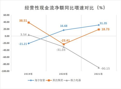 2019年至2021年,海尔智家的经营性现金流净额增速从-21.21%上升至31.35%。