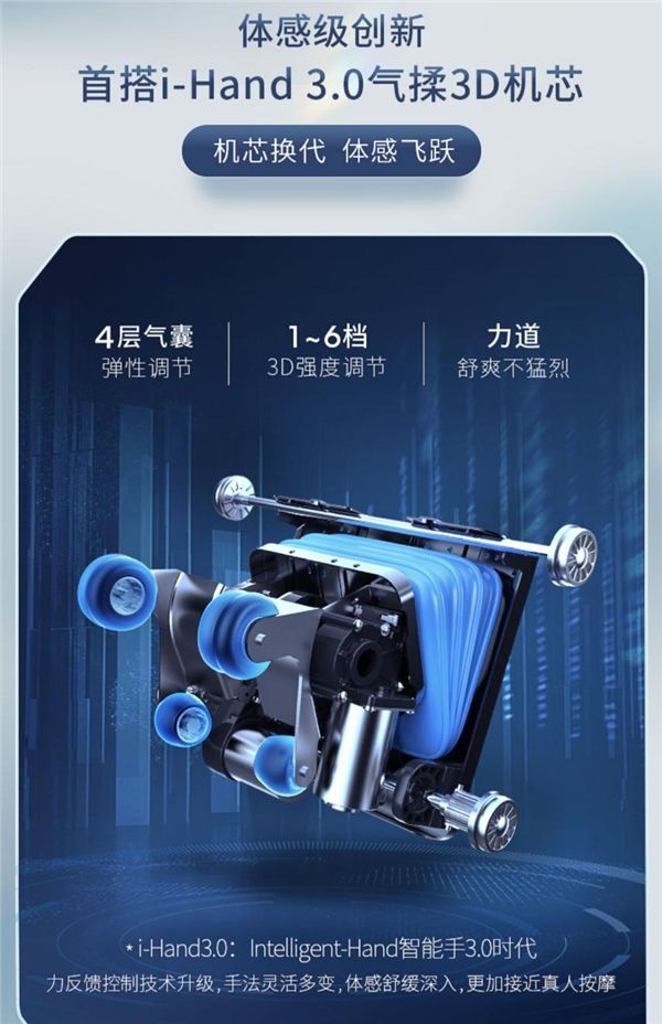 创新“揉感”入肌,升华按摩体感,以首次搭载的i-Hand3.0气揉3D机芯为动力支撑,通过力度反馈控制技术作为稳定器,让手法变换更流畅、力度过渡更自然,将体感从皮肤表面舒缓深入至筋膜层深处,以此开启智能手3.0时代。X9未来元气舱是更具科技感的健康智能家具,搭载AI智能语音交互系统,语音对话和液晶触控大屏双重交互系统,三种操纵系统可随意切换,将刻写未来的使命从使用体验起就开始描摹。