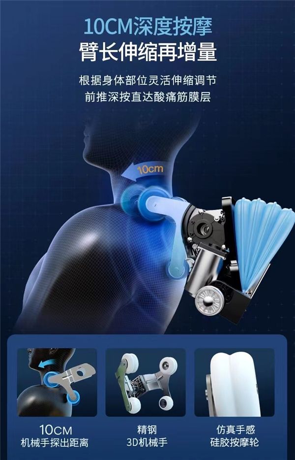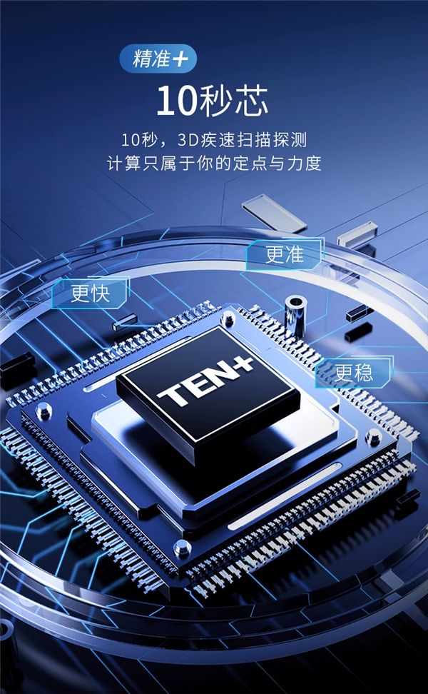 经典“10秒芯”此次全面升级为10秒型侦科技,创新增加了“分段式自动扫描”设定,从颈部到臀部,自动区分为肩颈、背部和腰臀三大核心区域,针对不同区域肌肉组群的特点分别以10秒为单位,进行分段探测,对人体进行3D地毯式全面探测,步步击破结节的肌肉防线。升级款同样搭载了生物电酸痛侦测技术,以肌肉的痛感应激反应为大数据AI算法的计算依据,为身体的酸痛程度划分等级,为人体匹配更科学的按摩方案。