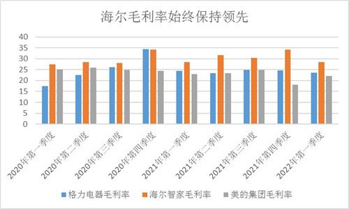 这体现在了三家的财报中。2021年报显示,美的海外毛利率为21.76%,同比-3.03%;格力海外毛利率为9.84%,同比-2.29%;海尔智家海外毛利率为28.21%,同比+0.2%。
