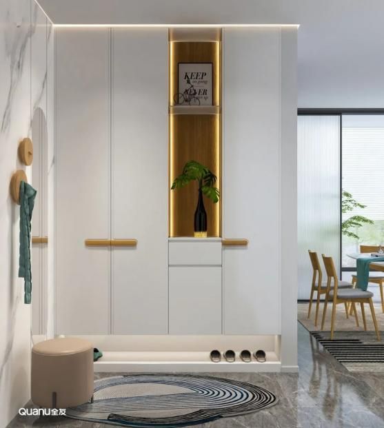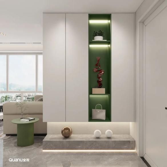 对于不想鞋子外露在入户空间的家庭而言,在玄关处做悬空设计,就是为了让入户空间打破整墙柜体带来的压迫感,再搭配上大理石或工艺品做装饰,就能提升家居格调,让人一进门就感受到主人的艺术品味。若是在悬空处再安装上感应式灯带,不仅让生活更便利,还能带来归家仪式感。