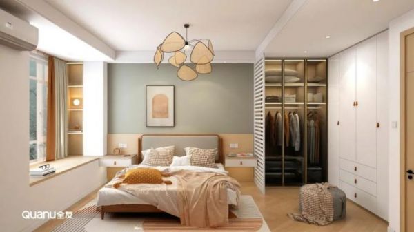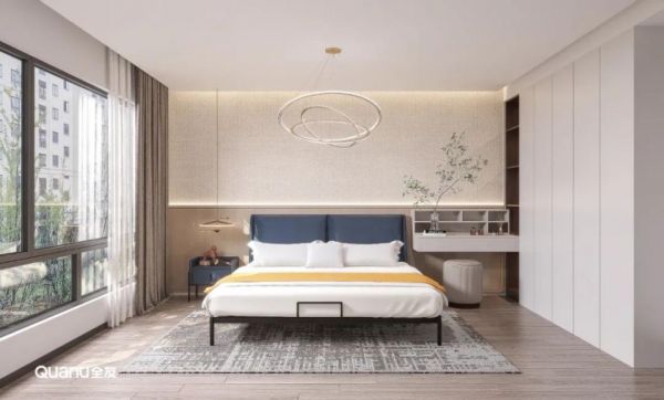 悬浮式床头柜比传统落地床头柜更轻巧、更具设计感,它完全不占用落地空间,如果是衣柜开放格延展出来的悬空床头柜,整体感还会更强。