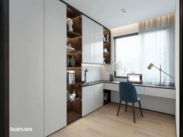 很多家庭会利用墙面转角处或靠窗位置定制悬空台面作为书桌,无桌腿设计打破了空间的固有格局,减少视觉上的“拥堵感”。上下空间都没有障碍,功能更丰富,也更方便放腿,不容易磕碰。
