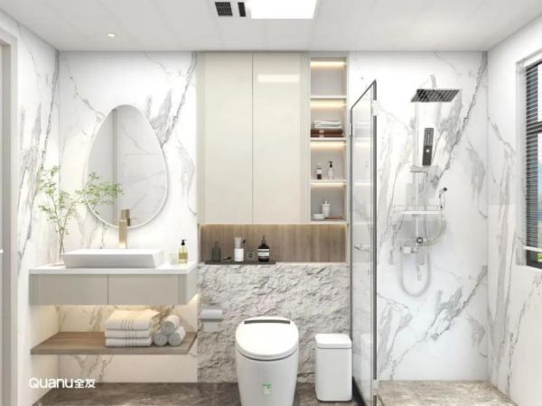 在浴室柜的选择上,现在更多的人喜欢壁挂式设计,也就是悬空式的浴室柜,这种浴室柜颜值高、体积更小,看起来不那么笨重呆板,镜柜+储物柜的搭配,不仅增加了储物空间,还能营造出轻盈又大气的层次感。