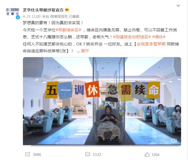 30年来,芝华仕致力于为千家万户带来健康、舒适、超值、时尚的家居,这一品牌理念不仅是对消费者的一个承诺,也是对员工的一种关怀,五一调休,工作实苦,急需续命,芝华仕#带薪续命区#福利曝光,工作日期间,员工可以去专门设置的舒适区带薪休息,引来无数身在职场的年轻人羡慕的目光,也让芝华仕成为了年轻人眼中的“别人家的公司”。