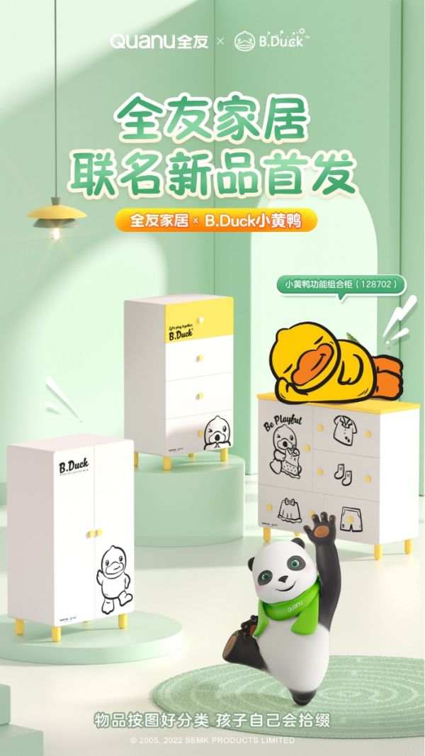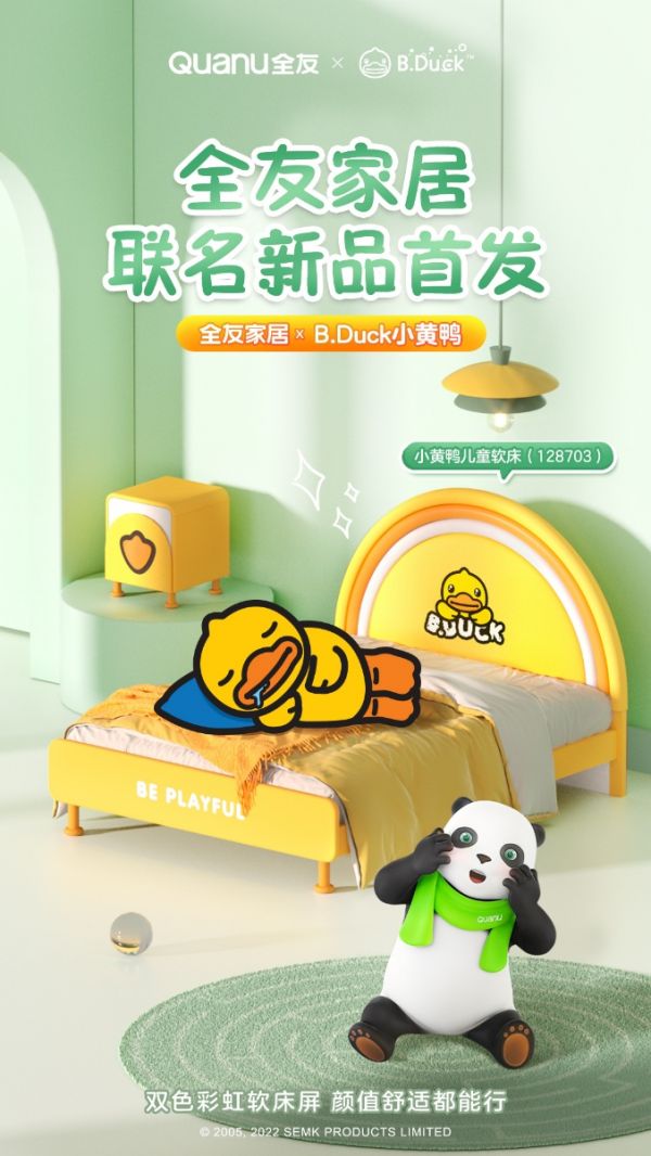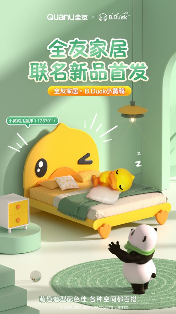以“创造美好家居生活”为企业使命,多年来,全友都致力于为万千家庭打造温馨、美好的家居生活环境。孩子,是家庭的欢乐与希望,在开发、设计儿童家居的过程中,全友始终坚持站在儿童的角度与视角,在保证家居安全、环保、健康、实用的同时,也通过丰富多彩的童趣设计,为孩子的童年带来更多的快乐体验,此次全友与 B.Duck 小黄鸭的联名合作亦是如此。