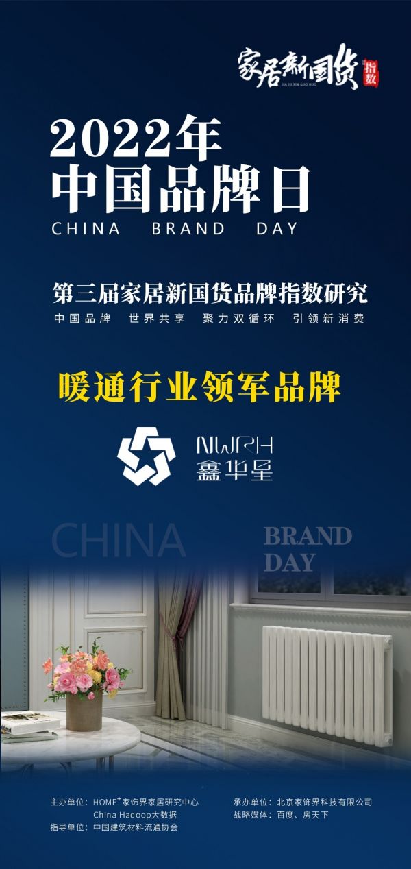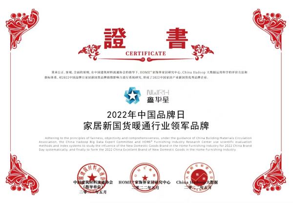 为展现2022年家居新国货真实面貌,宣扬国货品牌影响力,在第六个“中国品牌日”来临之际,在中国建筑材料流通协会的指导下,HOME家饰界家居研究中心和China Hadoop 大数据基于网络数据及行业洞察5月10日在北京发布了《2022年中国品牌日|第三届家居新国货品牌指数研究报告》,并为业界评选出2022中国家居产业新国货优秀品牌企业。“老字号”暖通品牌鑫华星再次成功出圈,获新国货品牌指数研究暖通行业领军品牌。