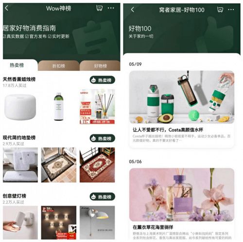 为了帮助消费者提高购物决策效率,居家版块还联合窝者家居推出了“WOW神榜”和“好物100”购买指南,针对年轻群体热衷的香薰蜡烛、创意壁灯、折叠雨伞、便携水杯等细分品类,“懒人”们可以直接根据榜单、指南一键下单,便捷又省心。
