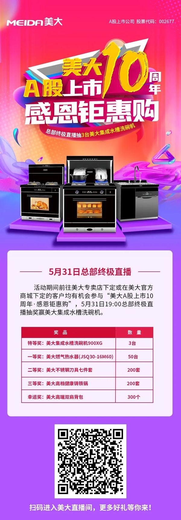 周年庆感恩钜惠将为广大消费者带来重磅福利,全国联动直播抽奖,只要前往美大门店购买产品即有资格参与抽奖,好礼持续放送,精彩福利不断,规模空前,钜惠升级。更有重磅多重壕礼回馈,5月31日19点美大总部大直播抽奖为十周年感恩助力,终极大奖3台美大集成水槽洗碗机,等您带回家!活动期间,只要在美大专卖店或直播间美大官方商城下定的顾客,均有机会参与总部直播大抽奖,多重好礼层层加码,机会多多。