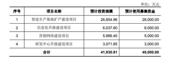 本次IPO,科凡家居拟募资4亿元,主要用于智造生产基地扩产建设项目、信息化升级建设项目、营销网络建设项目、研发中心升级建设项目以及补充流动资金,具体情况如下: