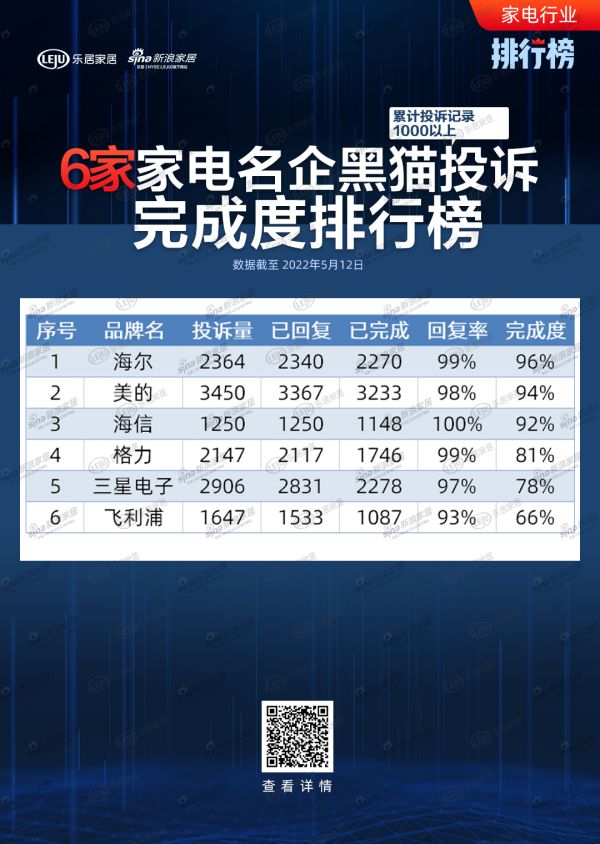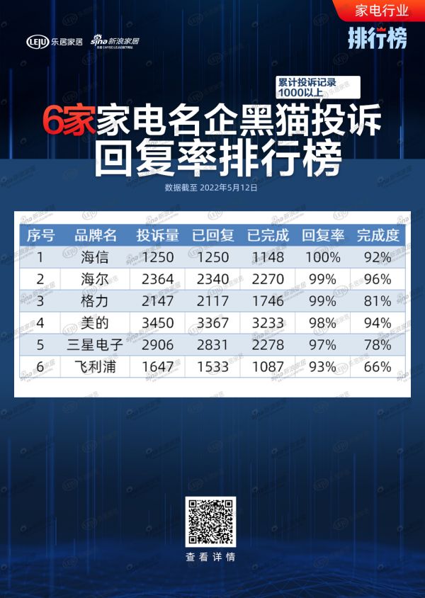 家电名企黑猫投诉完成度排行榜 6家企业实现完成度及回复率均超90%(5月12日数据)