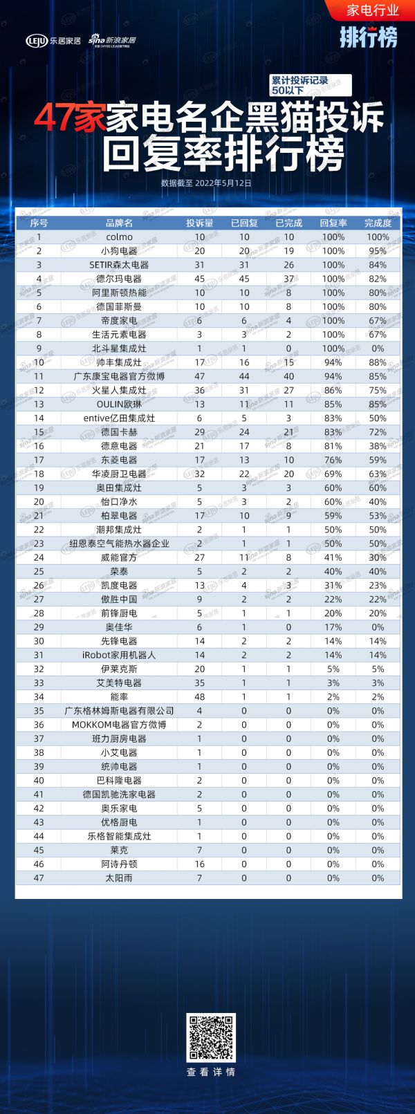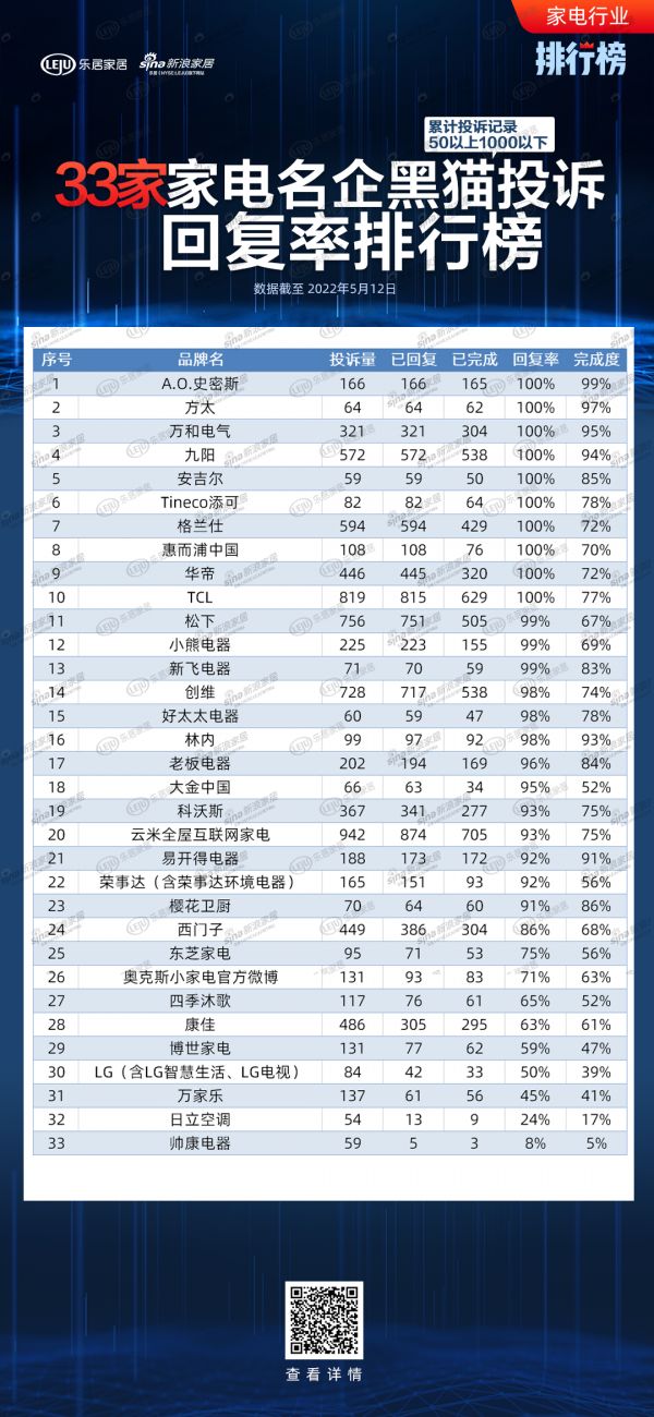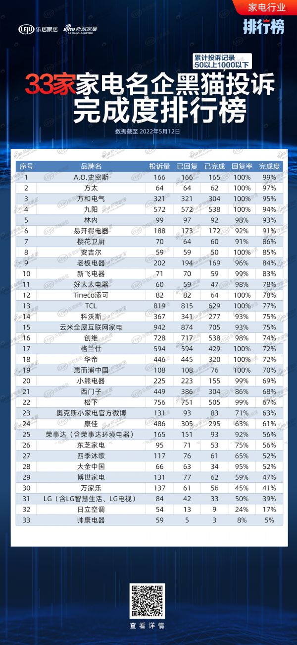 2022年5月家电名企黑猫投诉完成度及回复率排行榜细榜