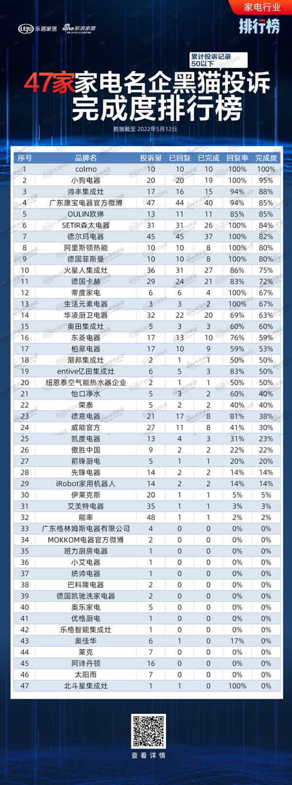 为帮助广大消费者更及时直观了解到家电品类商家服务质量,2022年1月1日起,新浪家居家电事业部每周根据最新数据汇总统计家电名企黑猫投诉完成度排行榜。其中3月15日-5月10日,因开展《中国好家居——2022中国家居消费者口碑调查》活动(点击查阅活动详情),4月榜单停发一期,故自今年1月1日起,至今已发榜累计4期(点击查阅更多家电周榜内容)。