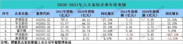 近日,罗莱生活、孚日股份、水星家纺、富安娜、梦洁股份、真爱美家,六家家纺行业上市公司的2021年年报均出炉,搜狐焦点家居从业绩表现、线上运营和品牌转型三维度出发,对其进行数据对比和行业剖析。